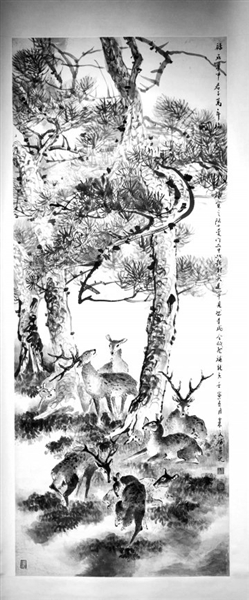 我从母亲那里继承姑婆的所有文物遗产后,对这幅松鹿图画稿特别喜爱,常拿出来欣赏。她山水花卉作品里的苍松垂柳,多数充满了女性的清新俏丽,笔墨精致淡雅,却很少有这幅画里的松树树干挺拔刚劲,充满阳刚之气。难怪她画完树干后,刚搁笔就疲乏至极。反复琢磨后我猜测:其一,这是她晚年想对自己画艺的创新突破。其二,姑婆的这幅松鹿图,隐含她自己是那些鹿,在党和政府这棵大树庇佑下,幸福地安享生活。姑婆对党和人民政府一直怀有浓厚报恩的心情。
