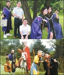 部分毕业生还将专业特色融入拍摄:医学生以实验室为背景拍出悬疑片;《爱情公寓》《甄嬛传》《西游记》(见左图)等经典影视剧频频被翻拍;更有毕业生邀请导师一同“入戏”,为师生情谊增添一份轻松与趣味。