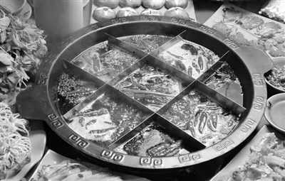 通常是一个铁锅或铜锅,里面放上一个铁架隔断,这种隔断,有四格的,有九格的,只隔菜不隔汤,不同的客人上桌子,认准自己那一两格,烫得呼儿嗨哟。