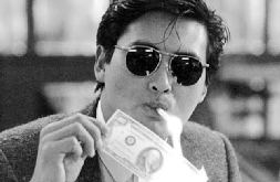 周润发抽烟也如此。周润发和吴宇森都是汉弗莱·鲍嘉的影迷,周润发抽烟很像鲍嘉,烟搁在嘴角,小手枪似的,既解释了自己身份,又震慑住周围。《英雄本色》(1986年)里,吴宇森用发哥点烟一个镜头就解释了整个电影的主旨。周润发穿西装戴墨镜,华丽丽用盗版美钞点烟,然后对着镜头,喷出一大口烟(见图)。后面的剧情显示,周润发要烧掉这个对不起他们兄弟的伪钞黑帮。