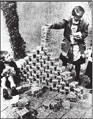 通货膨胀最严重的阶段,有人描述当时的场景:工人们的妻子在厂子门口推着小车等待发薪,一领到成捆的钱,她们推车一溜小跑直奔食品店,购买面包和生活必需品,一刻也不敢耽搁。因为很可能“上午买面包的钱,下午连面包渣也买不起了”。上万亿的马克,真的只能换一片面包了。